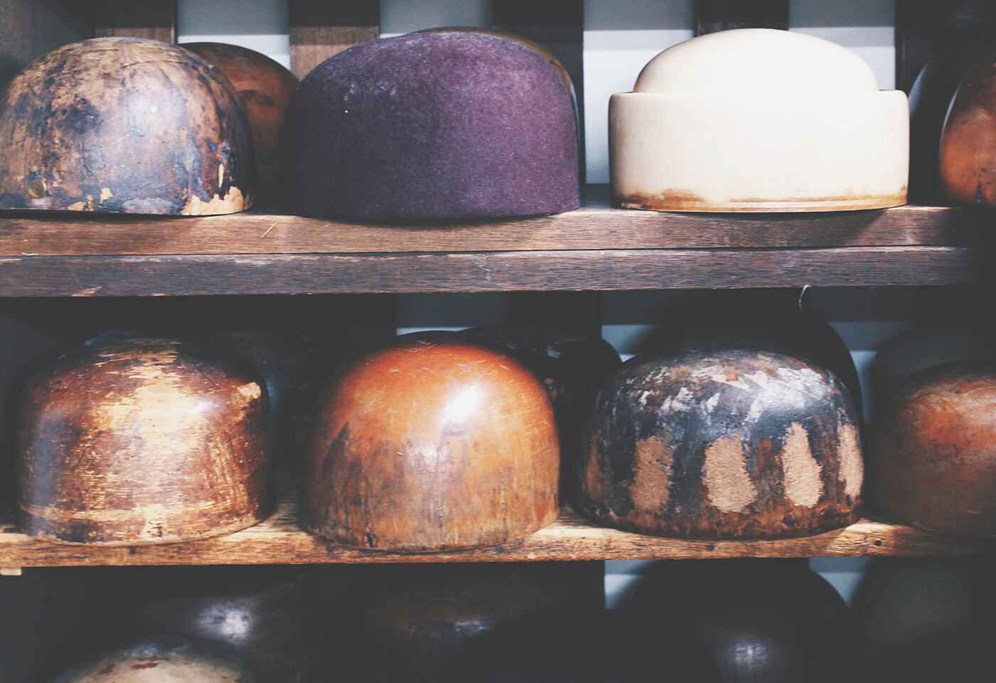 使い込まれた型は頭の型とつばの型の組み合わせにより様々な帽子を生み出します。